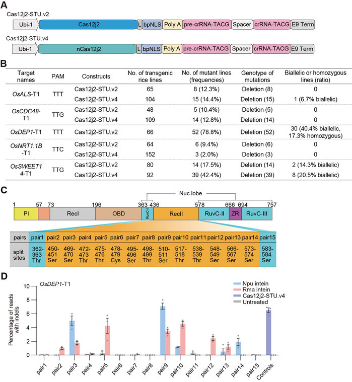 研究者首先通过crRNA的茎环结构优化筛选出了综合效率最优且最为保守的Cas12j2crRNA-TACG茎环变体,Cas12j2使用该crRNA变体产生的整体效率相比于原始crRNA获得了2倍的提升。随后研究者通过实验证实了Cas12j2对于孵育温度的敏感性。研究者进一步优化了Cas12j2系统的表达,通过单转录本STU(Single Transcript Unit)协调Cas12j2蛋白和相关crRNA的表达,以此为基础结合高效crRNA变体和最优spacer长度(18nt)创制的Cas12j2-STU.v2,在大幅提高Cas12j2的编辑效率的同时,也大大缩减了表达盒的体积并且简化了相关载体的构建流程。相比于前人常用双启动子分别驱动Cas蛋白和核酶介导crRNA加工的形式,无论是单靶点编辑还是多靶点编辑,STU表达形式都显示出了约5倍的编辑效率提升。Cas12j2-STU.v2在再生水稻植株中的编辑效率高达78.8%,该结果相比之前的研究报道有显著的提高。在Cas12j2-STU.v2基础上引入高效Cas12j2变体(nCas12j2)创制的Cas12j2-STU.v4,在部分编辑位点上又获得了1.2到2.4倍的编辑效率提升。进一步通过蛋白结构分析,在Cas12j2蛋白的RecⅡ柔性区域引入拆分位点,将其分成两个组分。两组分通过内含肽完成在细胞内的“顺式”剪接,其中在S511拆分位点,拆分后的Cas12j2在水稻原生质体中获得了与未拆分形式相当的编辑效率,为未来通过病毒载体传递完整的CRISPR-Cas系统奠定了技术基础。