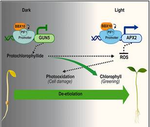 图2.BBX10-PIF1-GUN5/APX2 分子模块促进植物子叶去黄化的工作模型