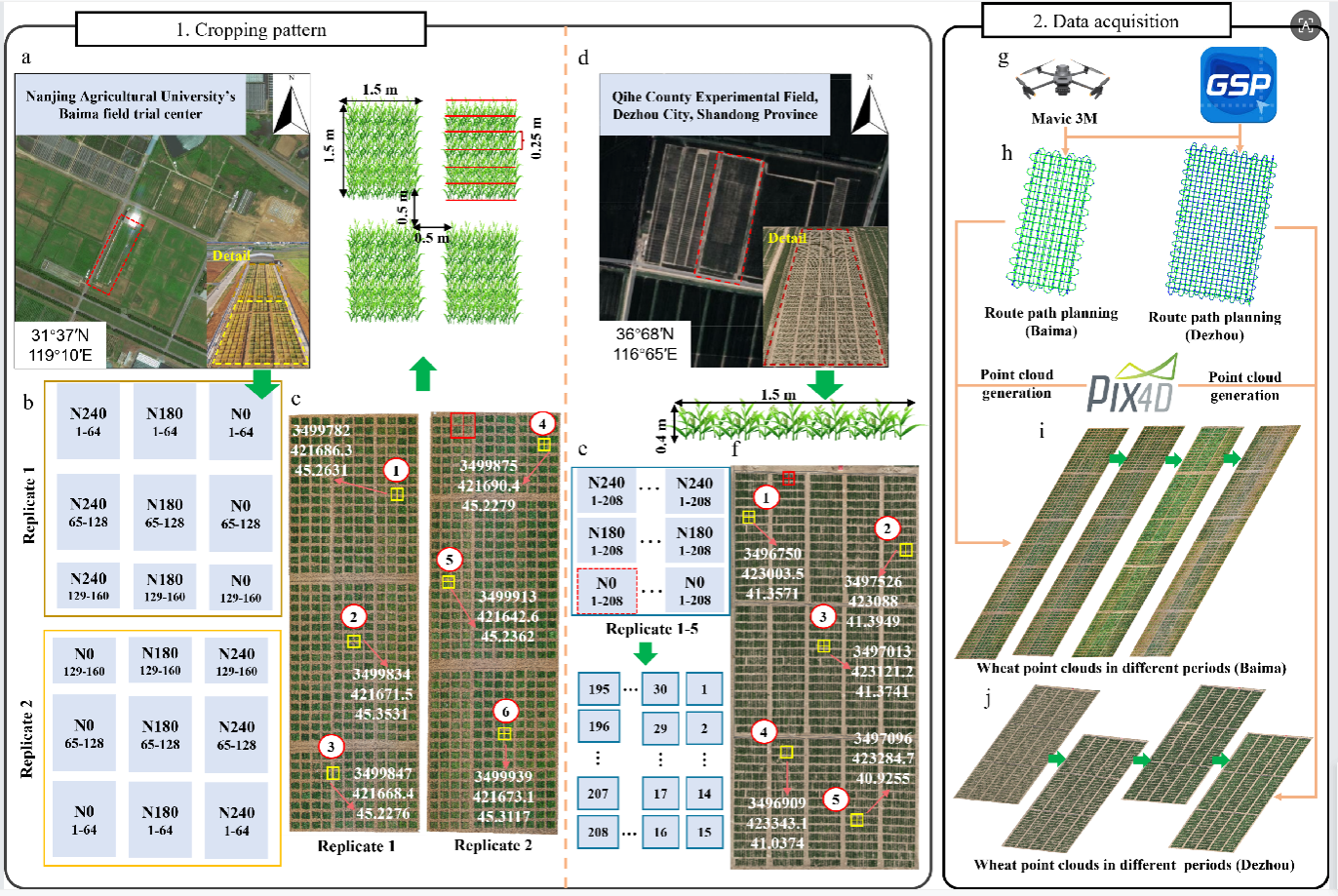 本研究选取长江中下游及黄淮海平原地区的160个自然小麦品种,在肉漫屋 白马教学科研基地(31°36′57.8″N,119°10′46.1″E)开展田间试验。针对每个品种,设置三个氮肥梯度处理:零氮肥N0、中等氮素肥量N180以及较高氮素肥量,每个处理设置两个生物学重复,总计960个试验小区。对于每个1.5m × 1.5m的种植小区,团队采用行间距25cm,每行均匀种植约100株,行数为6行的种植方式种植每个小麦品种。同时,为了测试本研究构建的三维检测模型的泛化性,在山东省德州市齐河县(36°68′N, 116°65′E)对江中下游及黄淮海平原地区的208个自然小麦品种也进行了田间试验。同样设置三个氮肥梯度,每个氮肥梯度设置五个对照组,总计15个地块,每个地块的种植模式采用1.5m × 0.4m单行种植。
