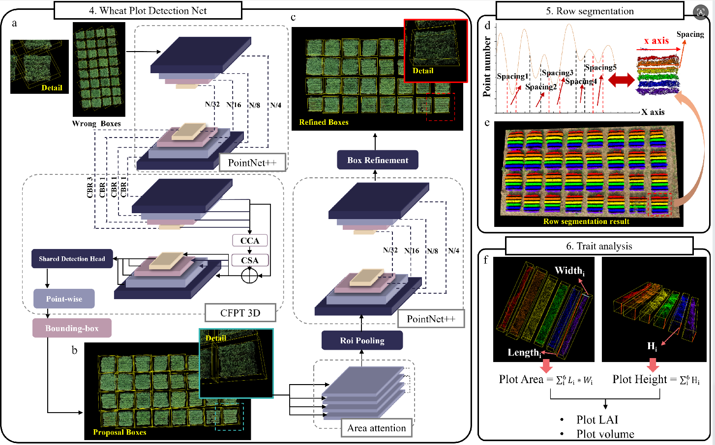 研究目标:为解决上述问题,本研究团队基于三维目标检测网络与动态时空表型构建了小麦全生育期长势和产量预测与分级的新框架,系统性地提升了小麦全生育期三维表型自动化分析与长势和产量预测的精度与效率。该框架包含五个主要创新点:(1) 提出三维基准面辅助的小区分割算法,实现高效点云提取与检测框快速标注,提升前期预处理效率。(2) 构建了融合三维跨层特征金字塔网络(CFPT 3D)与空间注意力模块(AATT)的3D Wheat Plot Detection Net,显著增强模型在深度特征识别和候选框关键特征提取方面的能力,兼具更优的精度与训练效率。(3) 创新利用点云密度空间分布实现行级点云分割,为独立计算行级表型参数提供基础。(4)开发3D Wheat Plot Phenotype Extraction软件,集成三维可视化与静态、动态表型自动提取,实现从点云处理到表型输出的全流程自动化。(5) 构建动态表型预测体系,根据小麦不同生育时期的静态表型提出性状快速变化期、缓慢变化期、降低期、最大高度/面积差及高度面积变化率五类动态时序表型,结合机器学习实现长势和产量的预测与分级。
