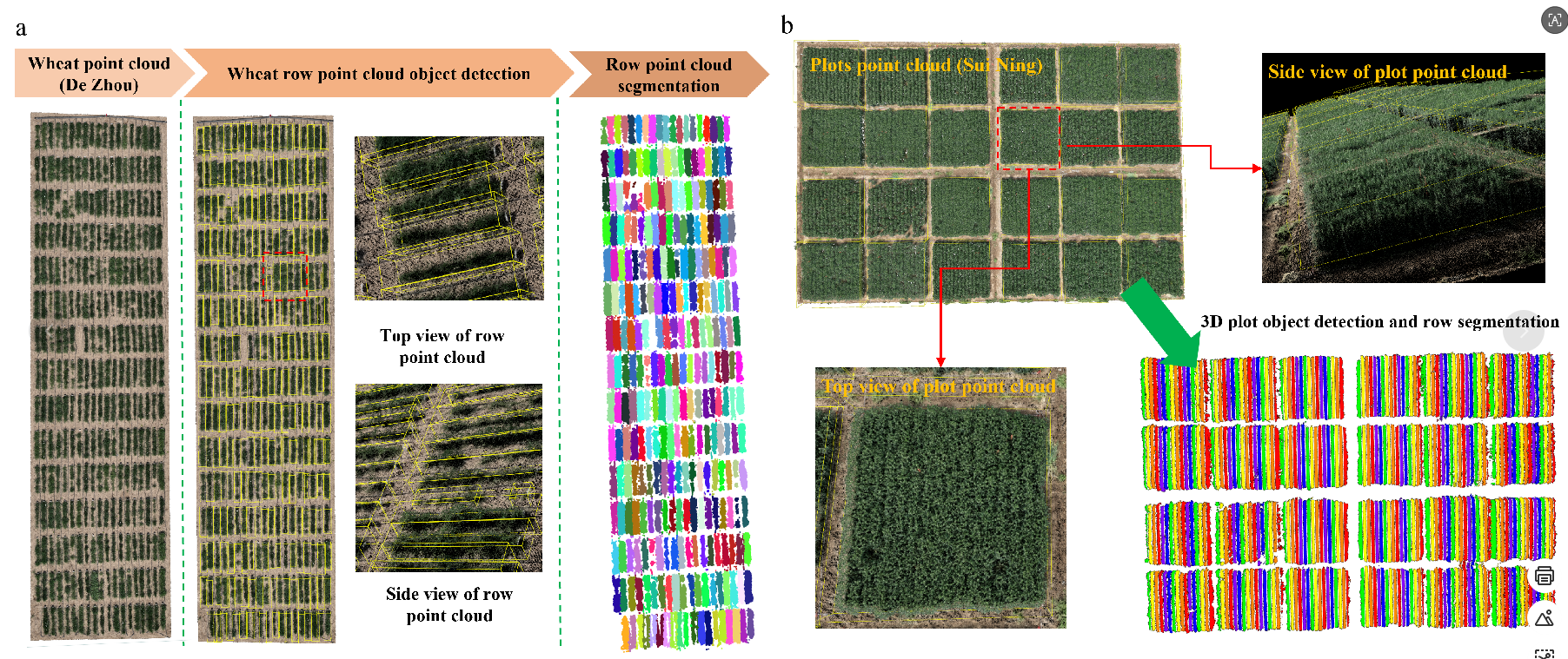 研究背景:目前,无人机系统对小麦不同生育时期的表型数据采集主要依赖二维图像。虽然二维影像能够提取冠层高度、冠层面积等重要表型参数,但由于其本质上缺乏深度信息,在高密度种植条件下往往难以准确识别行间边界,从而限制了对试验小区的精细划分。相比之下,三维图像因包含丰富的空间结构信息,在密植田间环境中更具处理优势,更有利于实现小区级的自动化分析。因此,基于无人机系统的三维图像数据构建小麦生育时期的自动化表型分析流程,已成为值得重点关注的研究方向。