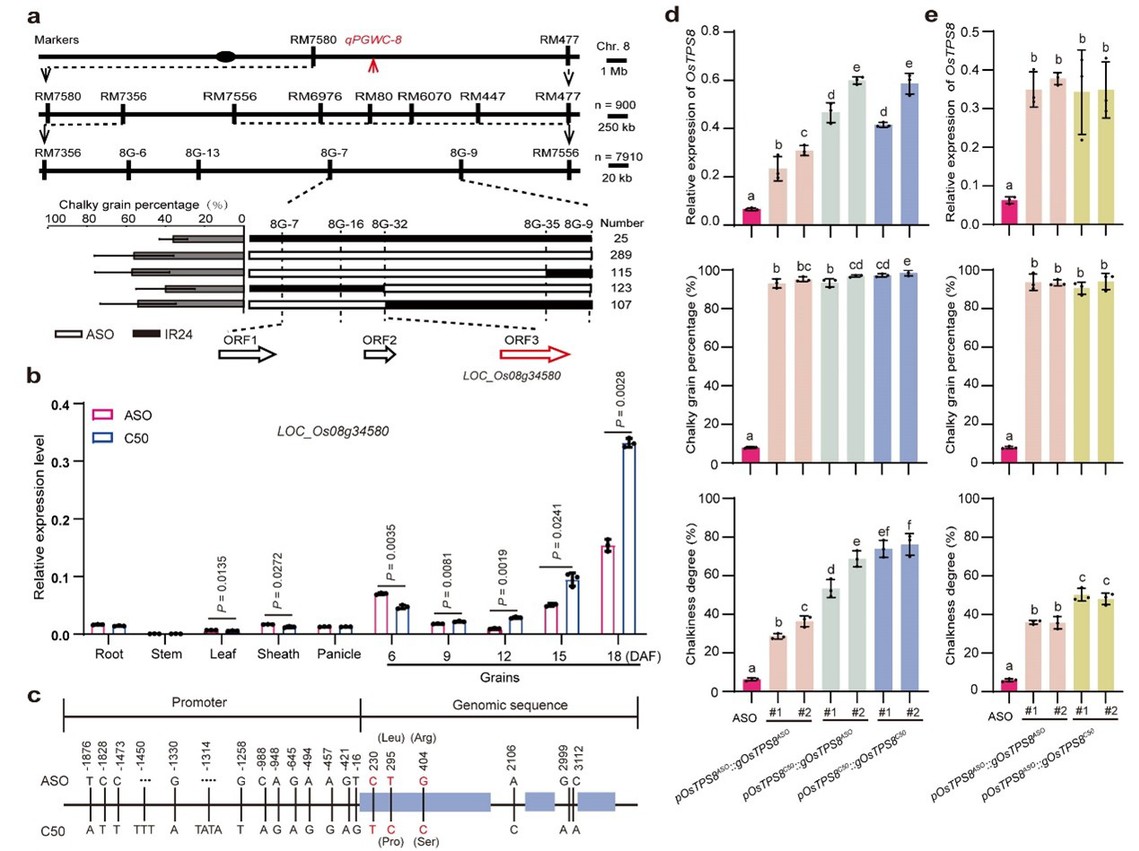 研究团队早在2002年从Asominori/IR24的染色体片段置换系中筛选获得一份高垩白株系C50,构建遗传分离群体,在水稻第8号染色体上定位到一个控制垩白的主效QTL qPGWC-8,进一步图位克隆和转基因验证证实调控垩白的基因是OsTPS8,其编码海藻糖-6-磷酸合成酶。研究发现,OsTPS8可与OsTPS1蛋白互作,抑制OsTPS1酶活性,从而降低胚乳中海藻糖-6-磷酸(Tre6P)的水平,进而降低对下游OsMYBS1转录因子及α-淀粉酶基因表达的抑制效应,发育胚乳中α-淀粉酶活性增加,促进胚乳淀粉降解,导致垩白形成。