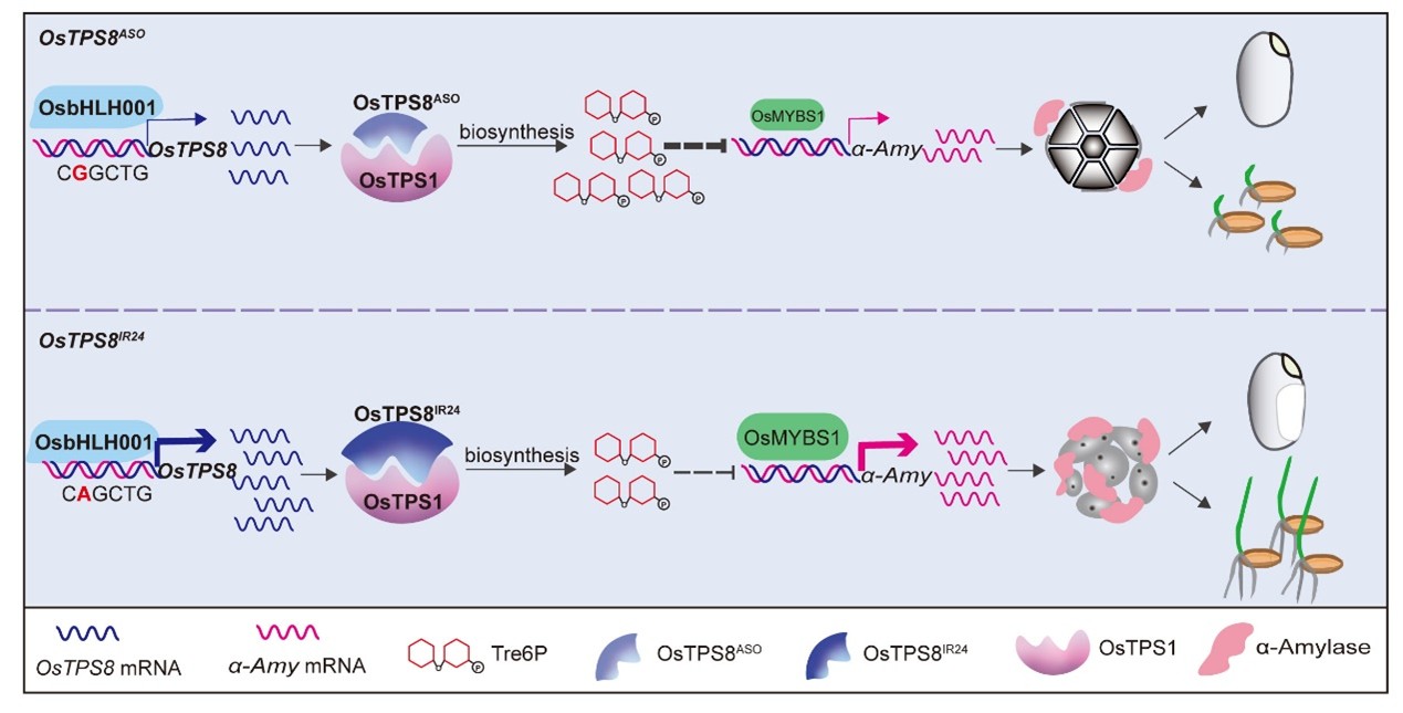 研究团队在OsTPS8启动子区鉴定到一个功能性SNP自然变异,影响了转录因子OsbHLH001对其的结合能力,从而造成OsTPS8在籼稻与粳稻中表达水平的差异。根据该自然变异,研究人员将OsTPS8划分为OsTPS8ASO和OsTPS8IR24两种单倍型,粳稻中保留了与野生稻一致的OsTPS8ASO单倍型,而OsTPS8IR24单倍型则在籼稻驯化过程中被优先选择。研究发现携带OsTPS8IR24单倍型的种子(主要是籼稻)α-淀粉酶活性高萌发快,这可能是OsTPS8IR24单倍型在籼稻中被驯化选择的动力。