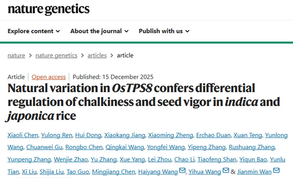 《Nature Genetics》在线发表万建民院士团队“Natural variation in OsTPS8 confers differential regulation of chalkiness and seed vigor in indica and japonica rice”