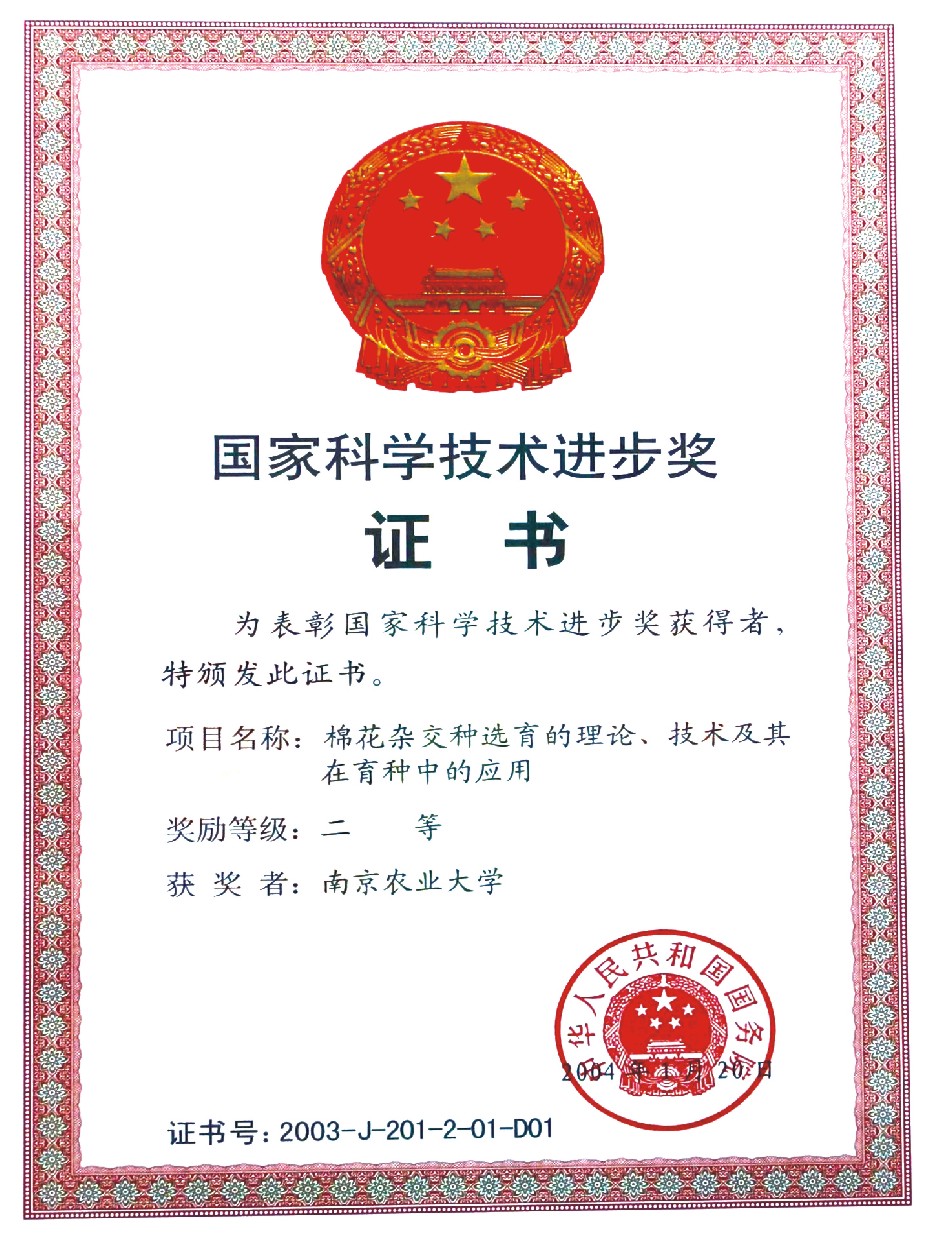 成果名称:棉花杂交种选育的理论、技术及其在育种中的应用