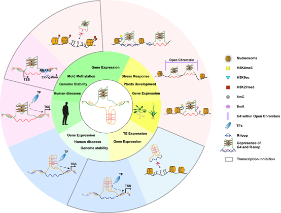 该综述总结了DNA G- 和C-quadruplexes (G4s和i-motifs)的鉴定方法,特别是高通量组学研究方法;系统总结并评论了其在人和植物中的生物学意义;最后,对该领域未来研究所面临的挑战进行了展望,为后续相关研究提供了新的策略和启发。进一步组学研究将有利于在全基因组水平提示:两种四联体结构通过影响基因表达,参与植物的生长发育和胁迫响应的分子机制。