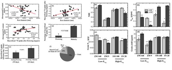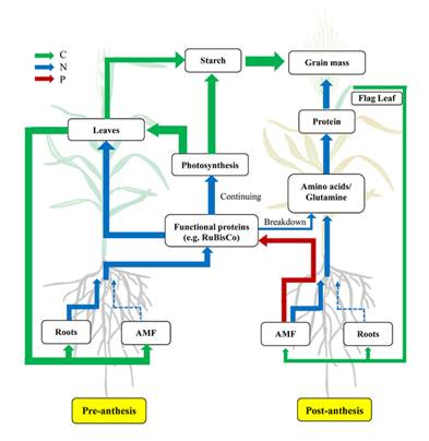 近日,肉漫屋 耕作制度与农田生态课题组的最新研究成果“Temporal complementarity be tween roots and mycorrhizal fungi drives wheat nitrogen use efficiency”在New Phytologist上发表。该成果揭示了氮高效小麦品种在花前依赖根系吸收氮素而花后依赖丛枝菌根真菌(AMF)促进花前吸收氮素转化形成籽粒产量的生育期互补机制。
