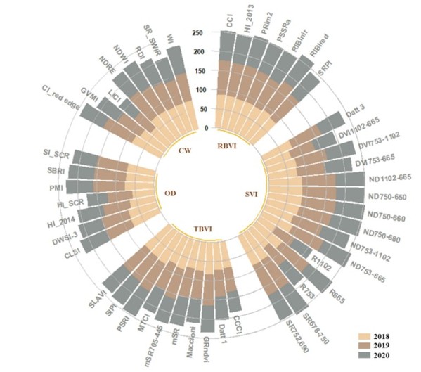 图2. RIBIs与传统光谱植被指数在温室(2018和2019)和自然条件下(2020)对健康与感病叶片分类精度的比较