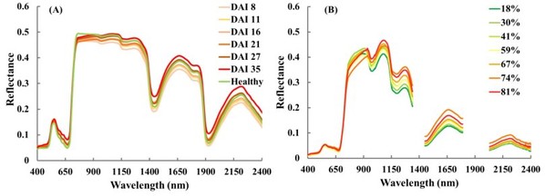 图1. 稻叶瘟侵染下不同病害严重程度的水稻光谱反射率