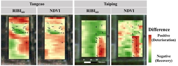 该研究进一步对Sentinel-2卫星影像提取的RIBInir进行时间序列分析和热点分析发现,在时间维度上,基于RIBInir的时间序列能准确追踪小农户田块中稻叶瘟的爆发与恢复态势,而传统植被指数NDVI对自然条件下稻瘟病发生过程的敏感性更差(图4)。空间维度上,RIBInir对稻叶瘟发生区域的刻画更加准确,稻叶瘟时空动态传播规律的与实地调查一致性更好(图5),卫星影像分析结果中表征病害恢复的绿色像素与呈现恢复趋势的黑色调查点吻合度更高。该研究构建了适用于叶片和冠层尺度的稻叶瘟敏感光谱指数,显著提高了对多尺度稻叶瘟发生的识别精度和对病情指数的估算能力;首次提出了基于光谱指数图的小农户田块稻叶瘟爆发热点识别思路,为基于卫星遥感的稻叶瘟传播概率等级划分和病害流行风险评估奠定基础。