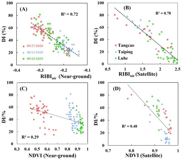 图3. RIBInir和传统指数NDVI在近地面(A和C)及卫星尺度(B和D)与稻叶瘟病情指数DI的相关性