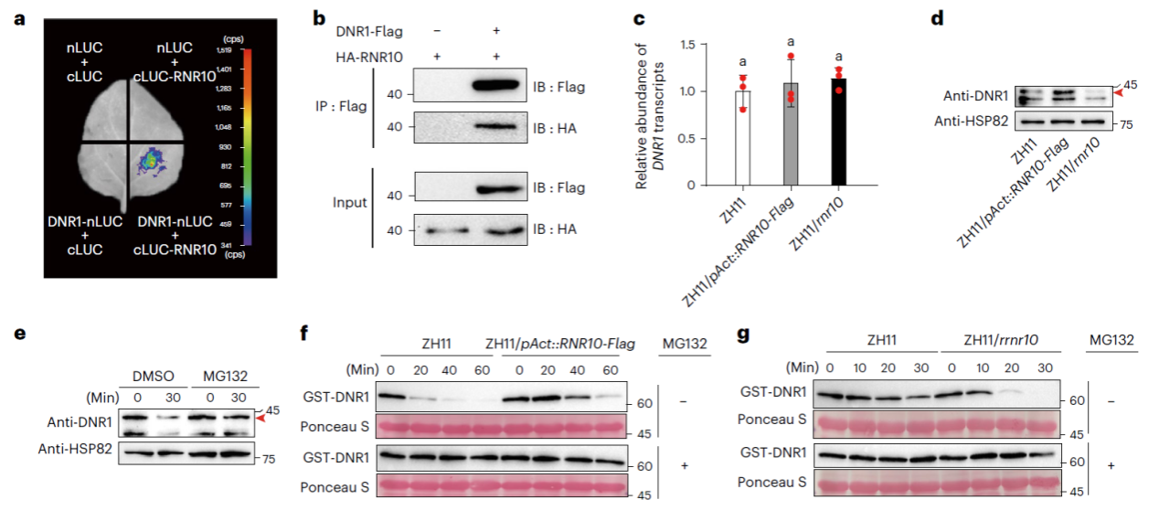 该课题组发现水稻籼、粳亚种根系对外界氮响应水平存在显著差异。与籼稻相比,在外界氮供应水平较低时,粳稻根系大小对于外界氮供应水平变化更加不敏感。为了明确导致籼、粳亚种根系对外界氮供应水平响应差异的调控因子,研究人员使用华粳籼74为背景的水稻单片段代换系材料鉴定到了一个调控水稻根系对外界氮响应的关键基因RNR10 (REGULATOR OF N-RESPONSIVE RSA ON CHROMOSOME 10),该基因编码F-Box蛋白。进一步研究发现RNR10与该课题组前期克隆的生长素生物合成途径负调控因子DNR1 (DULL NITROGEN RESPONSE1)存在相互作用,并通过K53位单泛素化修饰DNR1抑制其降解,从而拮抗生长素的积累,最终降低水稻根系对外界氮响应能力及其对硝态氮的吸收能力。