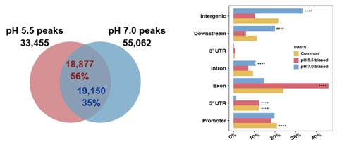 该研究首先利用iM-IP-seq方法,绘制了pH 5.5及pH 7.0 条件下水稻基因组iMs分布图谱。分别鉴定了33,455个pH 5.5和55,062个pH 7.0 特异的iMs位点。基因组分布结果显示,pH 7.0 特异的iMs位点主要分布于5’UTRs、基因间区、基因下游区域及内含子区域;相比之下,pH 5.5特异的iMs位点主要分布在外显子区域。