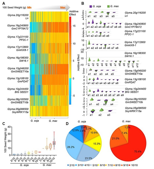 图2. 已知的大豆粒重相关基因等位基因分析