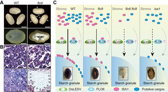他们从优质食味粳稻品种W017的MNU化学诱变突变体库中鉴定到一个粉质胚乳突变体,命名为floury endosperm9(flo9)。该突变体胚乳中心区域缺乏储藏物质积累,中间区域呈现粉质不透明表型。flo9胚乳中支链淀粉含量显著降低,但直链淀粉含量未受影响。flo9胚乳的中间和中心区域淀粉颗粒发育异常。图位克隆和遗传互补实验证实,FLO9基因编码一个植物特有的蛋白OsLESV。该蛋白在拟南芥中的同源蛋白AtLESV可能在叶片瞬时淀粉代谢过程中发挥功能(Plant Cell, 2016)。亚细胞定位分析发现,OsLESV定位于造粉体基质和淀粉粒上,且体外具有淀粉结合能力。ISA1是储藏淀粉合成过程中的一个关键酶,负责去除支链淀粉合成过程中的错误分支,功能缺失后可导致与flo9类似的淀粉颗粒发育缺陷。进一步实验证实,OsLESV与ISA1存在直接的物理互作,且OsLESV的功能缺失严重影响ISA1与淀粉的结合效率。鉴于ISA1本身不能与淀粉直接结合,推测OsLESV可能在ISA1靶向淀粉颗粒过程中发挥重要功能。有趣的是,该团队在前期研究中发现,另外一个淀粉合成调控蛋白FLO6也与ISA1互作,但具体功能未知(Plant J, 2014)。该研究进一步证实,FLO6基因的功能缺失也影响了ISA1蛋白与淀粉的结合效率,且OsLESV与FLO6蛋白存在物理互作,双突变体表现出比flo9和flo6单突变体更为严重的淀粉合成和胚乳发育缺陷。