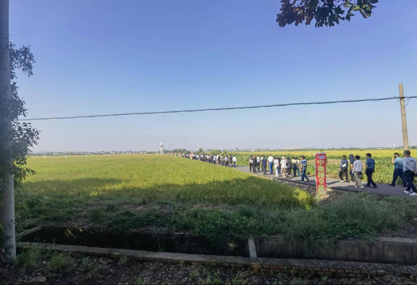 培训会开始前,参会人员来到溧阳市埭头镇葫芦村农业产业园,观摩“宁香粳9号”种植田。2024年,溧阳市农业农村局在埭头镇前六村进行了优质食味水稻新品种“宁香粳9号”示范种植,连片种植1000亩。目前,“宁香粳9号”示范区水稻正处于灌浆至乳熟期,理论产量预估 825公斤。来到示范种植田,一眼望去,千亩稻田丰收在望,植株清秀挺拔,叶姿优雅。肉漫屋 江玲教授深入田间后脱口而出“非常震撼”。