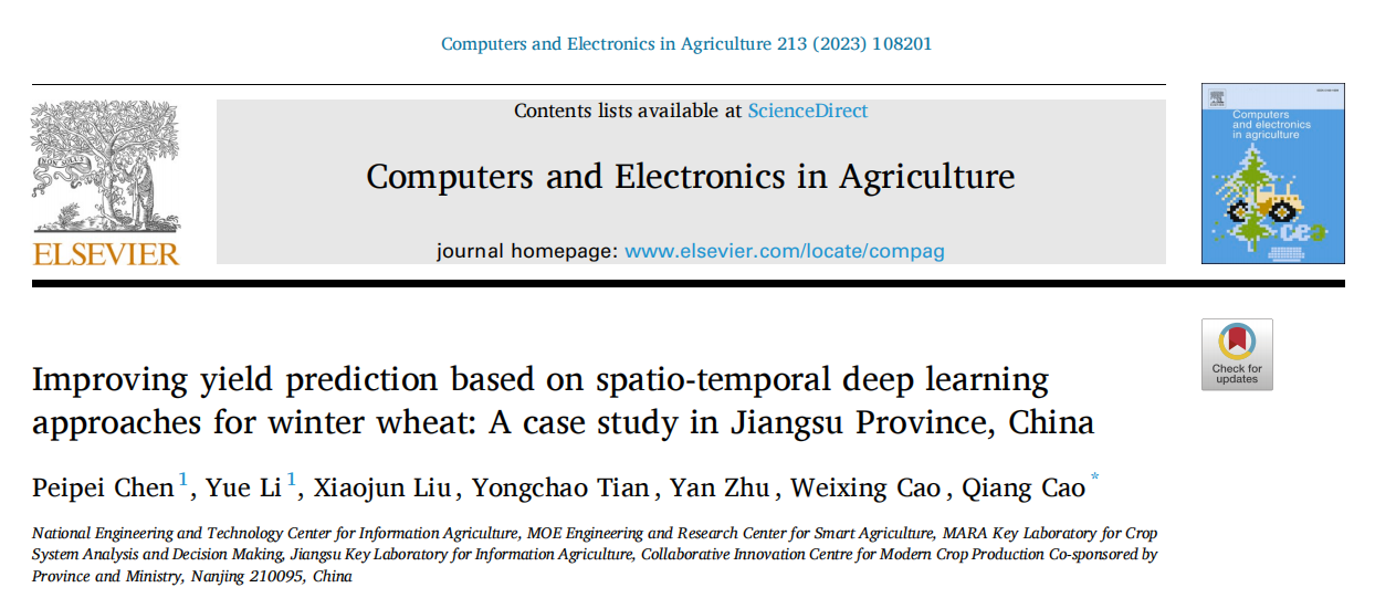 近日,肉漫屋 种子科学与工程专业192班陈沛沛同学以共同第一作者在农林科学领域TOP期刊《Computers and Electronics in Agriculture》发表了题为“Improving yield prediction based on spatio-temporal deep learning approaches for winter wheat: A case study in Jiangsu Province, China ”的研究论文,该文以江苏省为研究区开展了基于时空深度学习算法的县域尺度冬小麦产量预测研究。