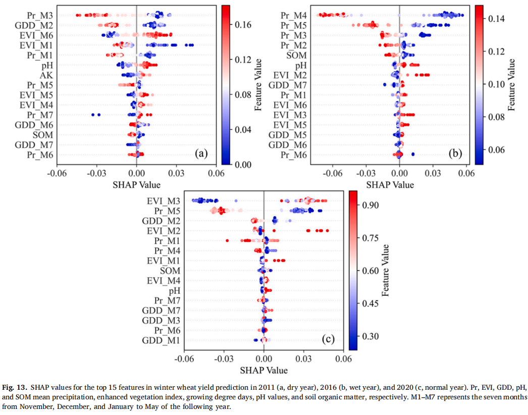 在影响江苏省冬小麦产量的主要环境因素中,气候因素最为重要,其中降水对产量的影响比温度更为显著,而土壤属性的影响较小,地形特征的影响最小。此外,气象因子和植被指数等动态变量为产量预测提供了作物生长的实时信息,进而实现了可靠的冬小麦产中产量预测,能够为产中管理提供信息支撑。
