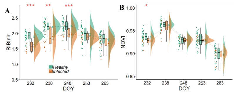 图4.试验区(以江苏省淮安市唐曹村为例)Sentinel-2影像植被指数的时间序列结果比较(A. RIBInir; B. NDVI)。红色星号表示不同水平下的显著性差异。