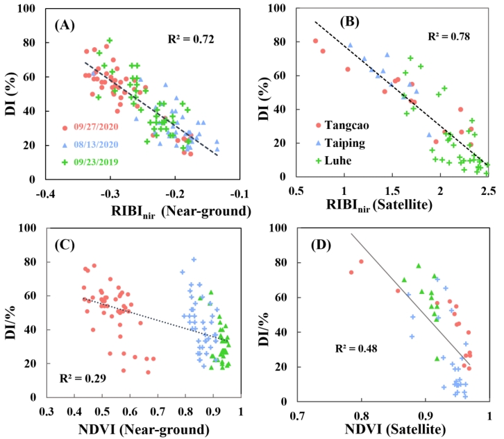 图3. RIBInir和传统指数NDVI在近地面(A和C)及卫星尺度(B和D)与稻叶瘟病情指数DI的相关性。不同颜色散点代表在不同时期和试验点获取的样本。