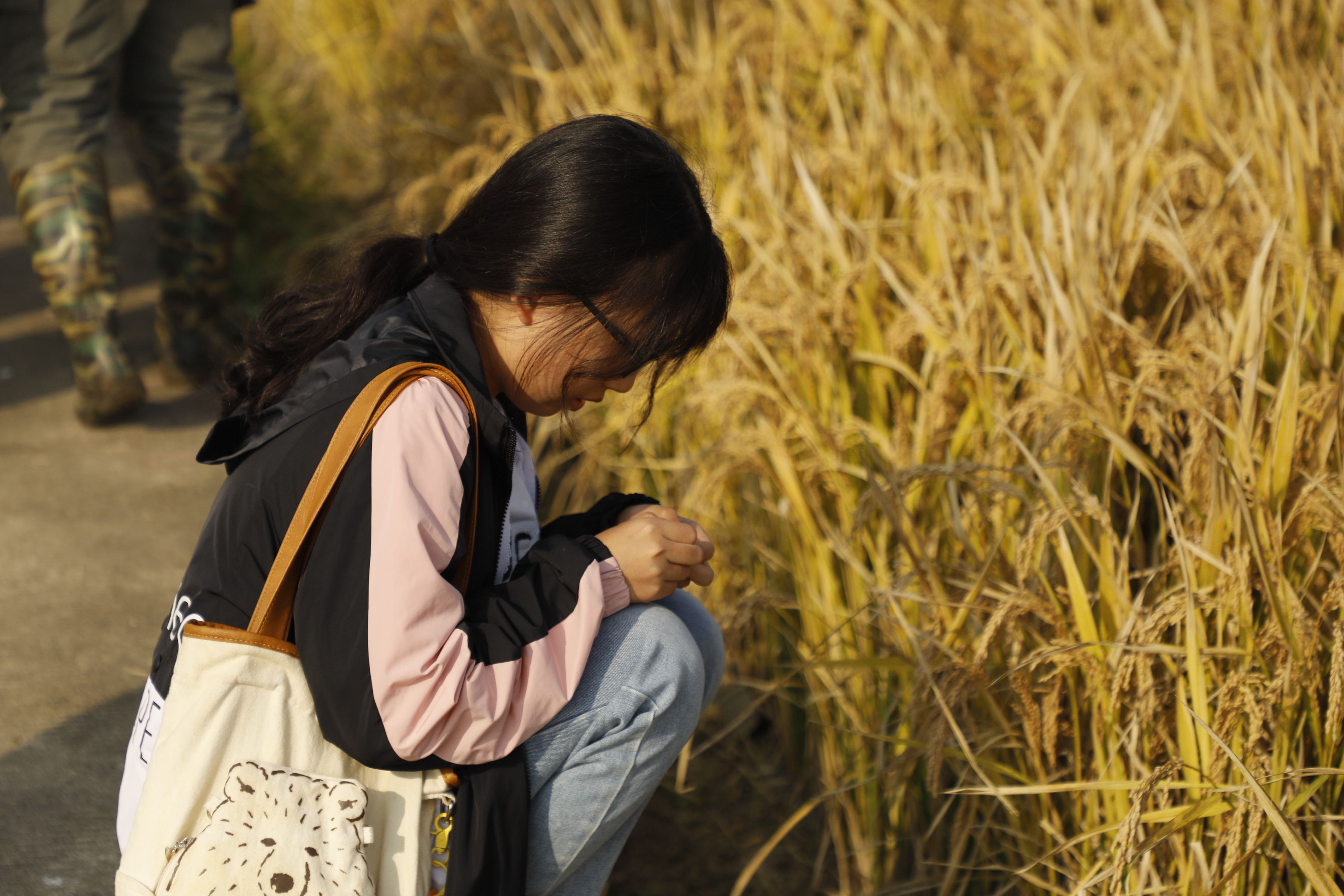 肉漫屋 土桥试验基地是肉漫屋 作物遗传与种质创新国家重点实验室和农业农村部长江中下游粳稻生物学与遗传育种重点实验室的水稻育种基地,也是南京水稻种质资源国家野外科学观测研究站的落地点。学生们到达土桥基地后,大片大片金黄稻田映入眼帘。这城市中难得一见的辽阔丰收景象与明艳色彩,勾起了同学们满满的热情与好奇。大家纷纷拿起手机拍照记录,还有做过功课的同学指着田间一个竖了标牌的田块喜道:“看!宁香粳9号,这个品种好耳熟啊,好像是得过全国品鉴会金奖的品种吧!”。