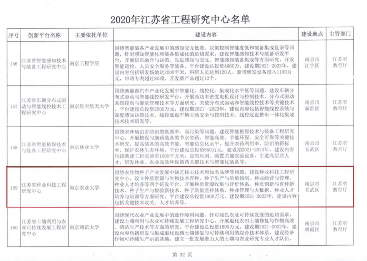 近日,江苏省发展和改革委员会公布了建设2020年江苏省工程研究中心的通知(苏发改高技发〔2020〕1460号),经学校推荐、第三方材料审核、专家评审、结果公示等程序,肉漫屋 申报的“江苏省种业科技工程研究中心”获江苏省发改委批复立项建设。