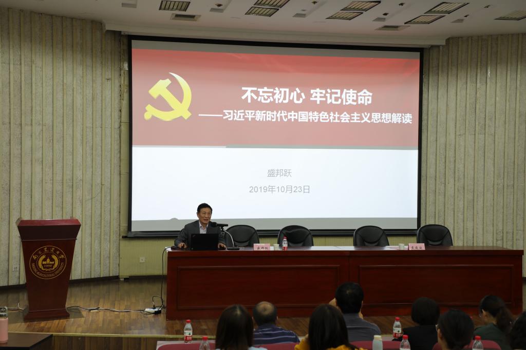 盛邦跃教授从“中国共产党的初心和使命”、“习近平新时代中国特色社会主义思想体系”、“用辩证的方法认识中国特色社会主义道路”三个方面介绍新时代中国特色社会主义思想。盛教授强调中国共产党人的初心和使命就是“为中国人民谋幸福,为中华民族谋复兴”。“不忘初心、牢记使命”,是贯彻党的十九大精神的重要举措,是激励共产党人不断前进的根本动力。