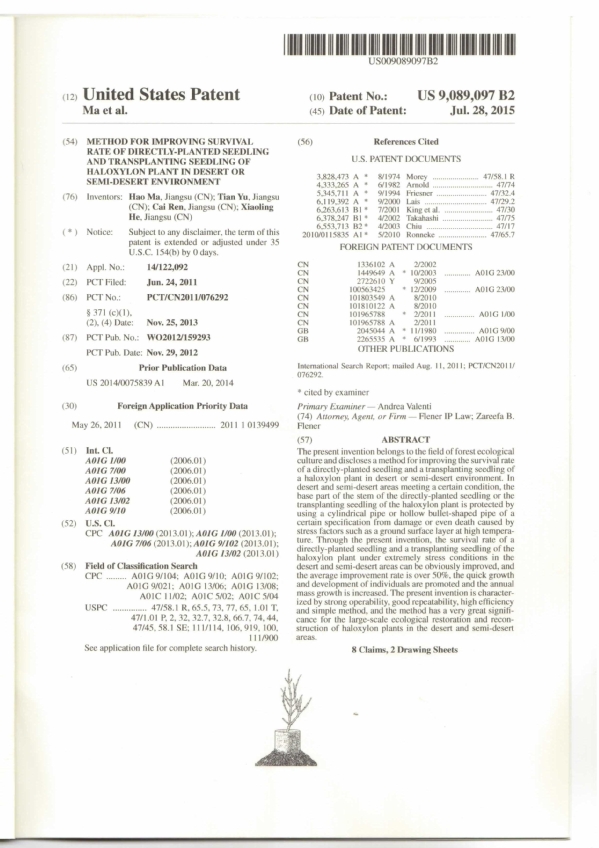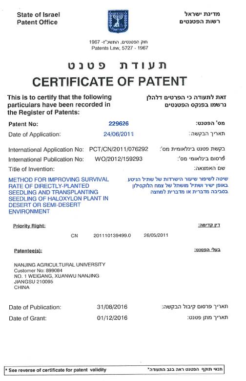 近日,由肉漫屋 麻浩教授所率科研团队经10多年潜心研究发明的“免灌溉管件防护荒漠造林技术”在获得多项中国国家发明专利和实用新型授权的基础上,又分别获得世界科技最发达国家美国和荒漠化防治领头羊国家以色列发明专利授权,为该荒漠化防治技术利器走上国际市场奠定了基础。