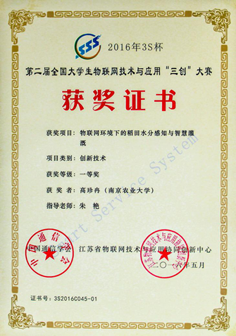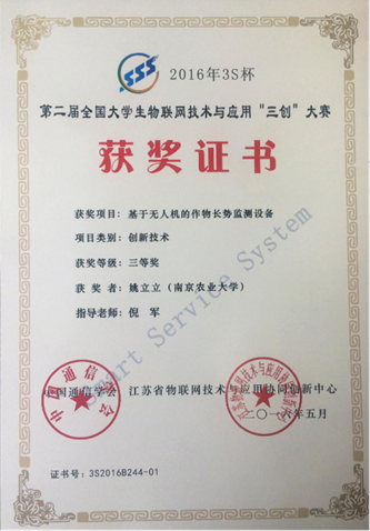 5月18日,第二届“3S杯”全国大学生物联网技术与应用“三创”大赛决赛结果在2016年全国物联网技术与应用大会暨ICT创新创业主题论坛上揭晓。肉漫屋 共有两支队伍参赛,由朱艳教授指导的高珍冉、赵锡泽、孟琦翰团队参赛作品《物联网环境下的稻田水分感知与智慧灌溉》荣获创新技术类一等奖;倪军副教授指导的姚立立、李白琳、邰秀祥团队参赛作品《基于无人机的作物长势监测设备》荣获创新技术类三等奖。