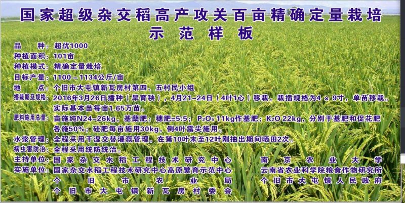 新瓦房村是国家杂交中心云南高原粮繁分中心(简称高原分中心)的高产攻关基地,自然条件优越。高原分中心一直在此进行“超优900”和“超优1000”等杂交稻的高产攻关,但由于缺少配套的栽培技术,难以突破900公斤/亩。2013年,受高原分中心盛情邀请,肉漫屋 水稻栽培组与云南省农科院开始在个旧新瓦房村进行高产攻关。示范前根据土壤、生态和品种特点,进行栽培方案精确设计;长期派驻研究生进行数据采集和技术落实。通过几年的技术攻关和示范,技术优越性迅速得到当地农民认可,技术到位率逐步提高。产量逐年实现突破,由2013年的901.95公斤/亩,2014年的946.5公斤/亩,突破到2015年的1067.5公斤/亩和2016年的1088公斤/亩。