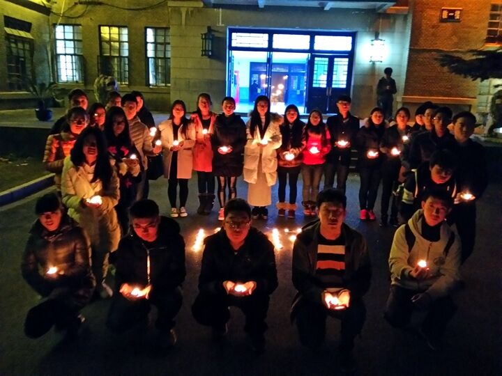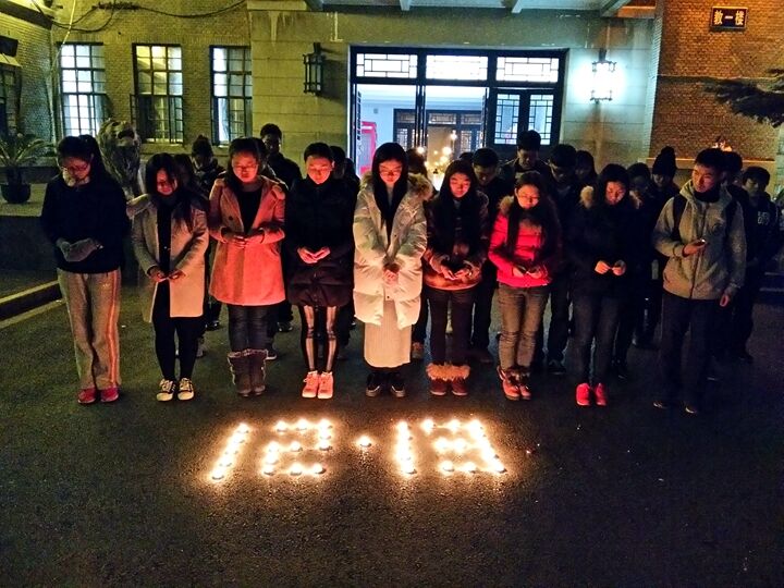 第二个活动是举行烛光祭悼念仪式。晚上7:00,肉漫屋 分党校组织本科生各党支部预备党员、党员以及12月份拟发展对象在肉漫屋 主楼南门举行烛光祭悼念活动。活动内容包括三个主要环节。首先,分党校秘书长靳雪莹进行12.13公祭日主题追思演讲,大家静默聆听,一同感受这一份沉重的追思之情。第二个环节,全体成员将蜡烛摆成“12.13”字样,点燃蜡烛,并在烛光下进行一分钟默哀,悼念逝者,不忘国耻。最后一个环节,全体成员每人手握一支蜡烛,围成心形,表达“铭记历史,圆梦中华”的志向和情怀。各党支部成员用烛光寄思,用默哀悼念,深切表达了这一份对逝者的祭奠之情。