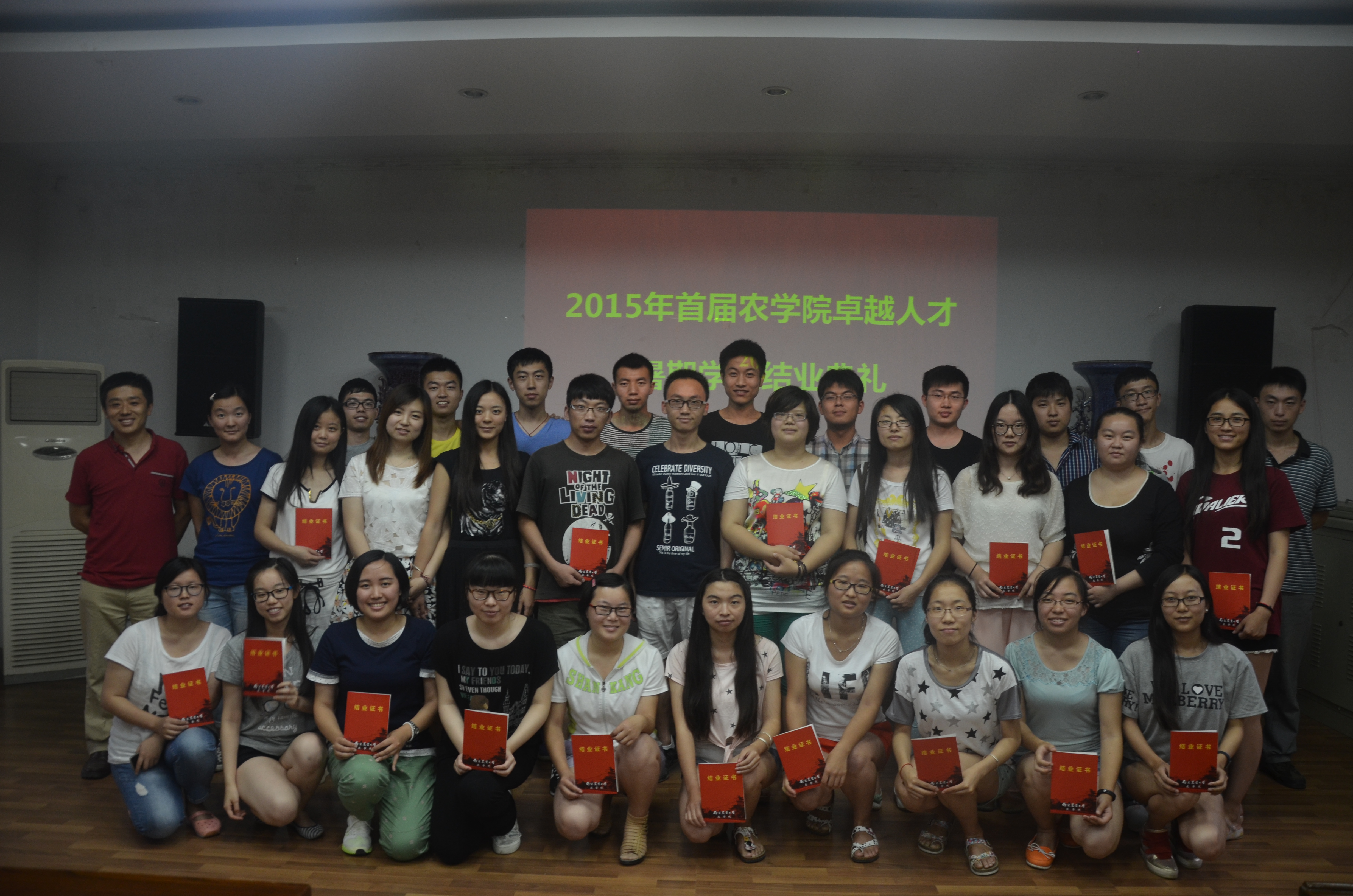 7月16日下午5:00,首届肉漫屋 卓越人才暑期学校结业典礼在生科楼E1001举行。肉漫屋 副院长黄骥、教务秘书郝佩佩出席了本次典礼,首届2012级31名本科生按时到场。