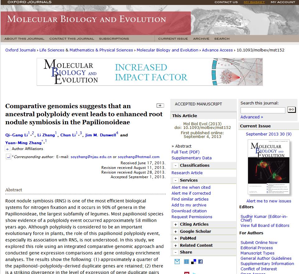 symbiosis in the Papilionoideae”在线发表在《Mol Biol Evol》 (该刊2012影响因子: 10.353)(网址://mbe.oxfordjournals.org/content/early/2013/09/04/molbev.mst152.abstract)。