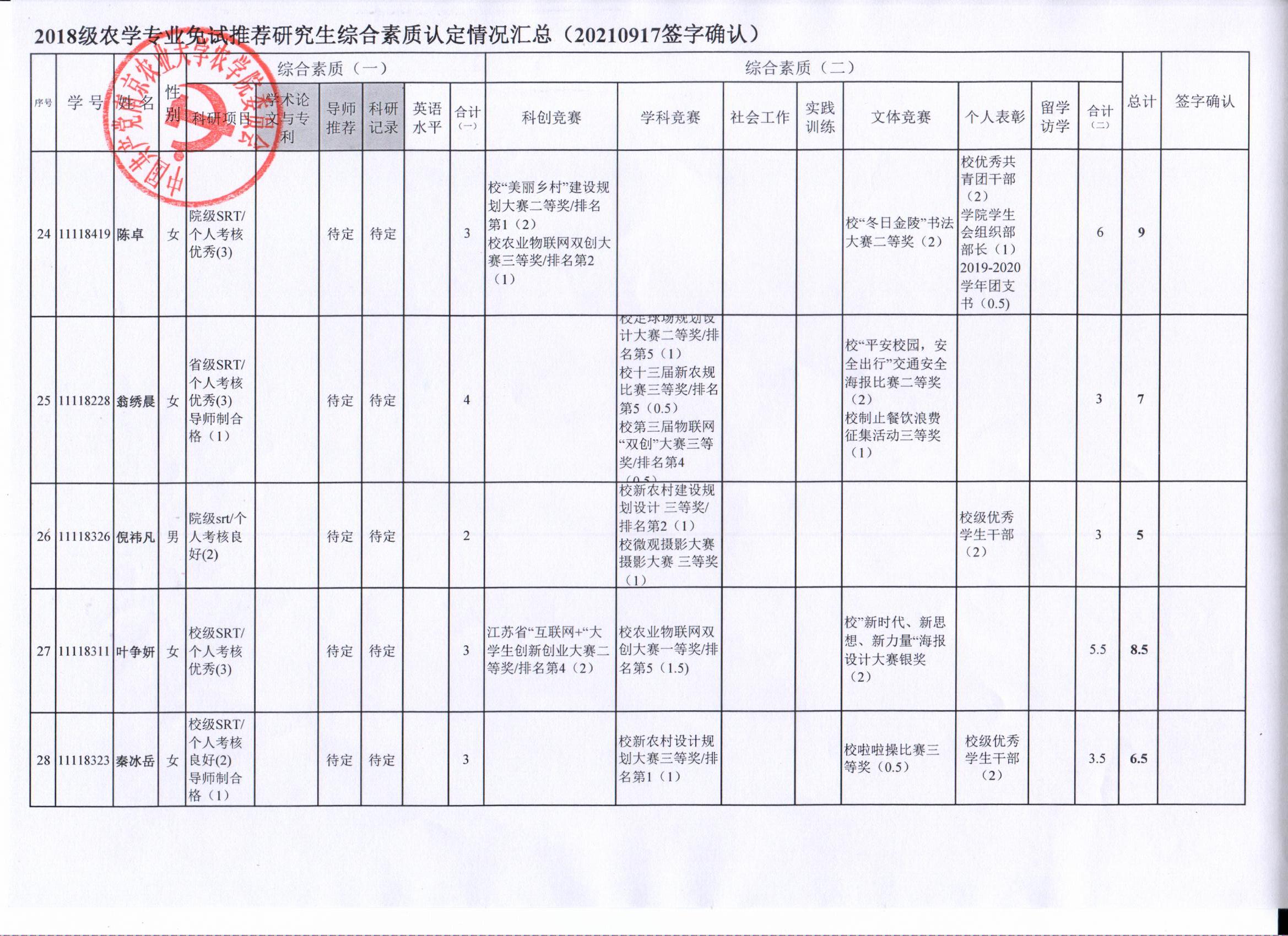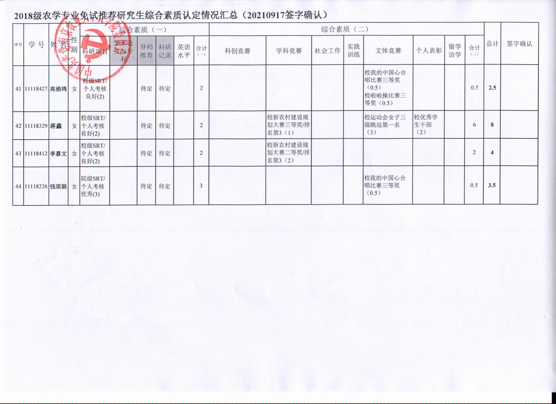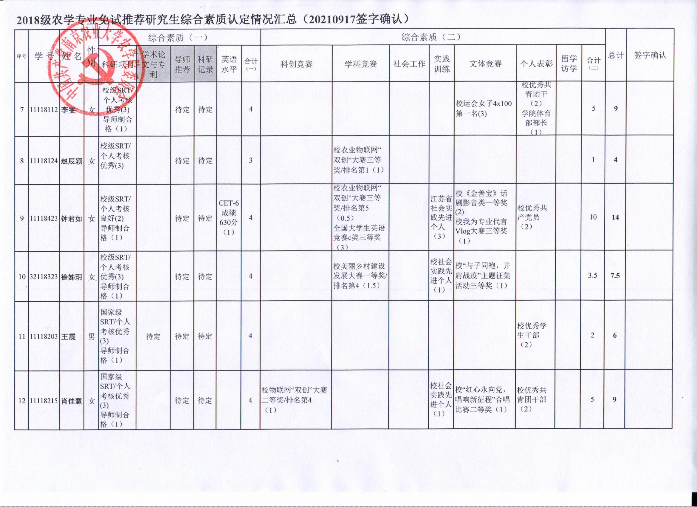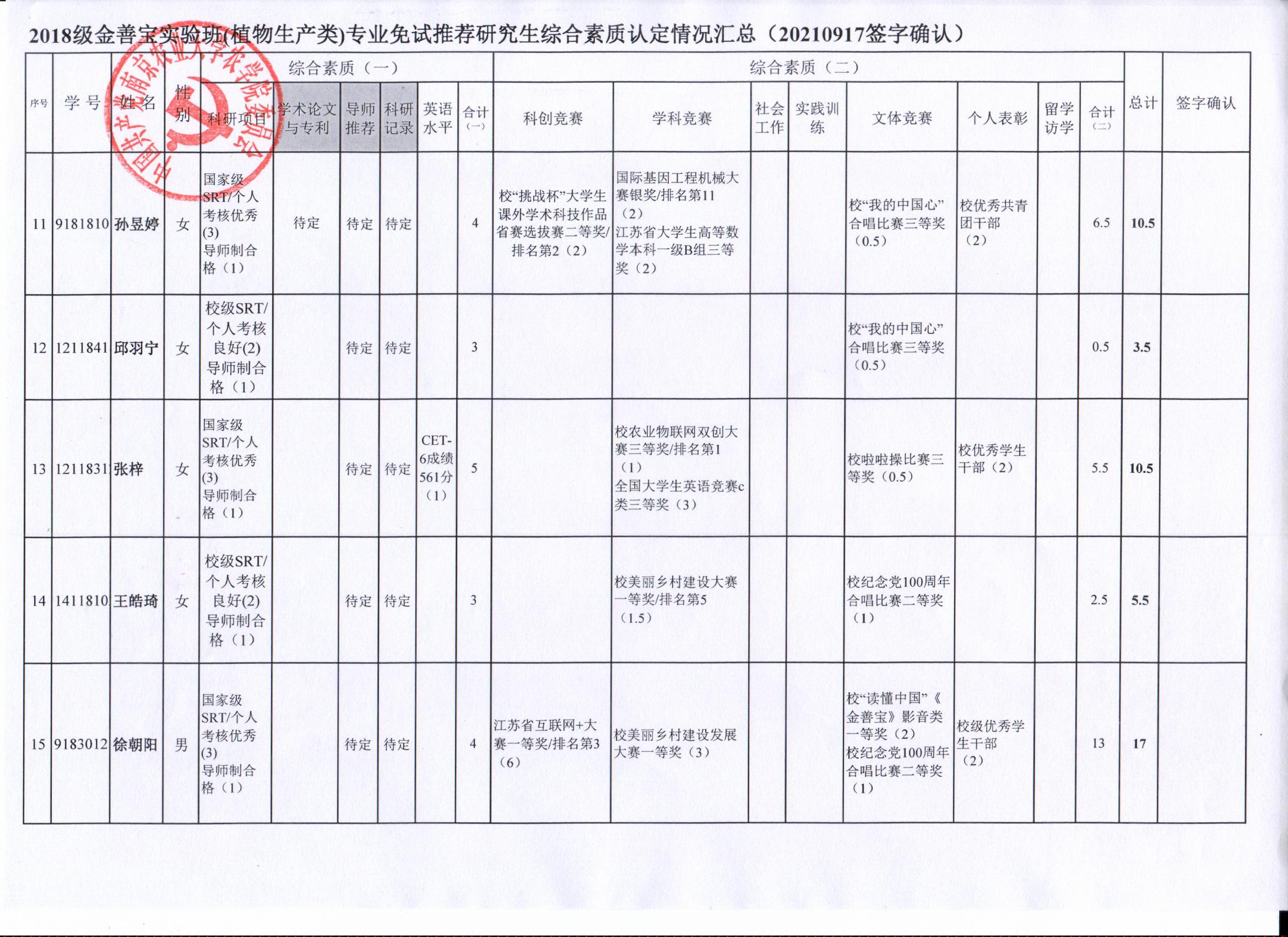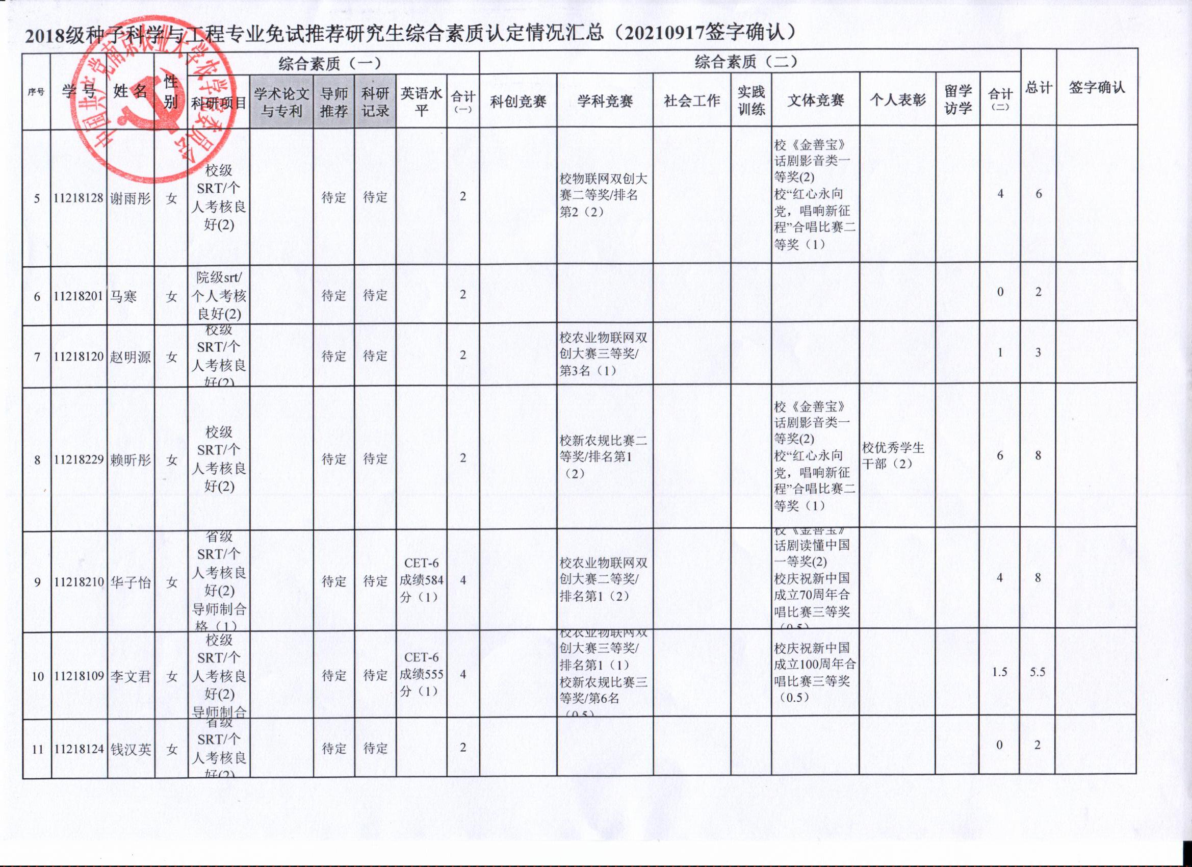2022年推荐优秀应届本科毕业生免试攻读研究生工作方案》精神,经学生自愿申请、学院审核及学生签字确认,综合素质(一)第一、五类与综合素质(二)所有类别得分情况已于9月17-19日进行公示,现予以再次公示。