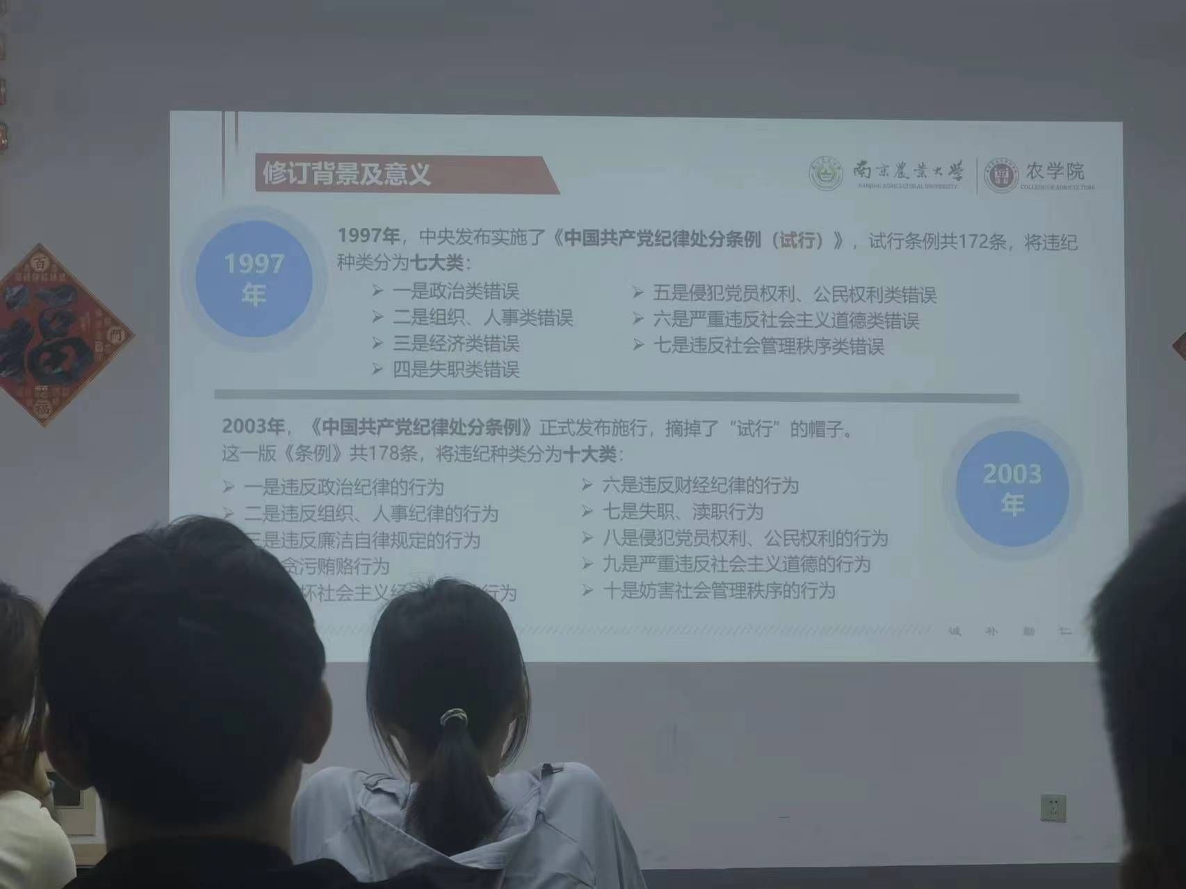 殷美从案例谈起,介绍了学习党规党纪的必要性,引导同学们要学纪、知纪、明纪、守纪。随后她从《条例》修订的背景及意义、《条例》修订的主要内容以及《条例》精神的贯彻落实三个方面带领本科生党员展开了学习。详细阐述了在当前形势下,修订《条例》的重要性和紧迫性,以及修订后的《条例》对加强党的纪律建设、推进全面从严治党的重要意义,鼓励各本科生党员要将《条例》学习常态化,把增强党性、严守纪律、砥砺作风融入日常、化为习惯。
