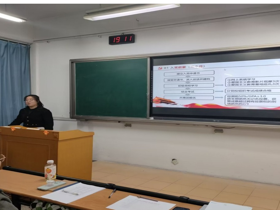最后,在微党课环节由豆弘宇同学向大家介绍了入党的具体流程。在向党组织靠拢的过程中,还要接受很多的培训,是对个人思想信念的砥砺和升华,更是对自己精神的洗礼。