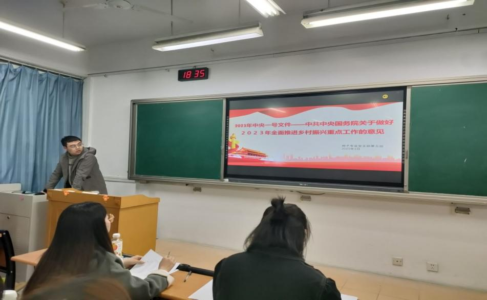 在理论学习环节,焦雨阳同学围绕“2023中央一号文件——中共中央 国务院关于做好2023年全面推进乡村振兴重点工作的意见”这一主题开展了理论学习。