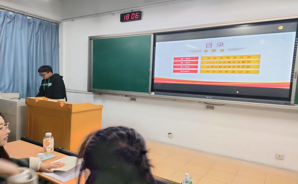 在本次分班讨论中,袁梓安同学以“会议及相关介绍”“2023会议概况及解读”“从两会知识看农业发展”以及“知识问答及讨论”四个方面全面而又深刻地解读了两会在农业发展上的相关表述。