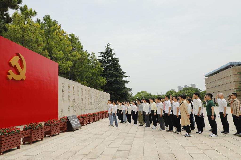 参观结束后,肉漫屋 一行在党旗前庄严宣誓。整齐洪亮的宣誓声在广场上回响,47名党员佩戴党徽,在领誓人的带领下,高举右拳庄重宣誓,表情严肃坚定,承诺掷地有声,表达了为党的事业奋斗终身的决心和信念。