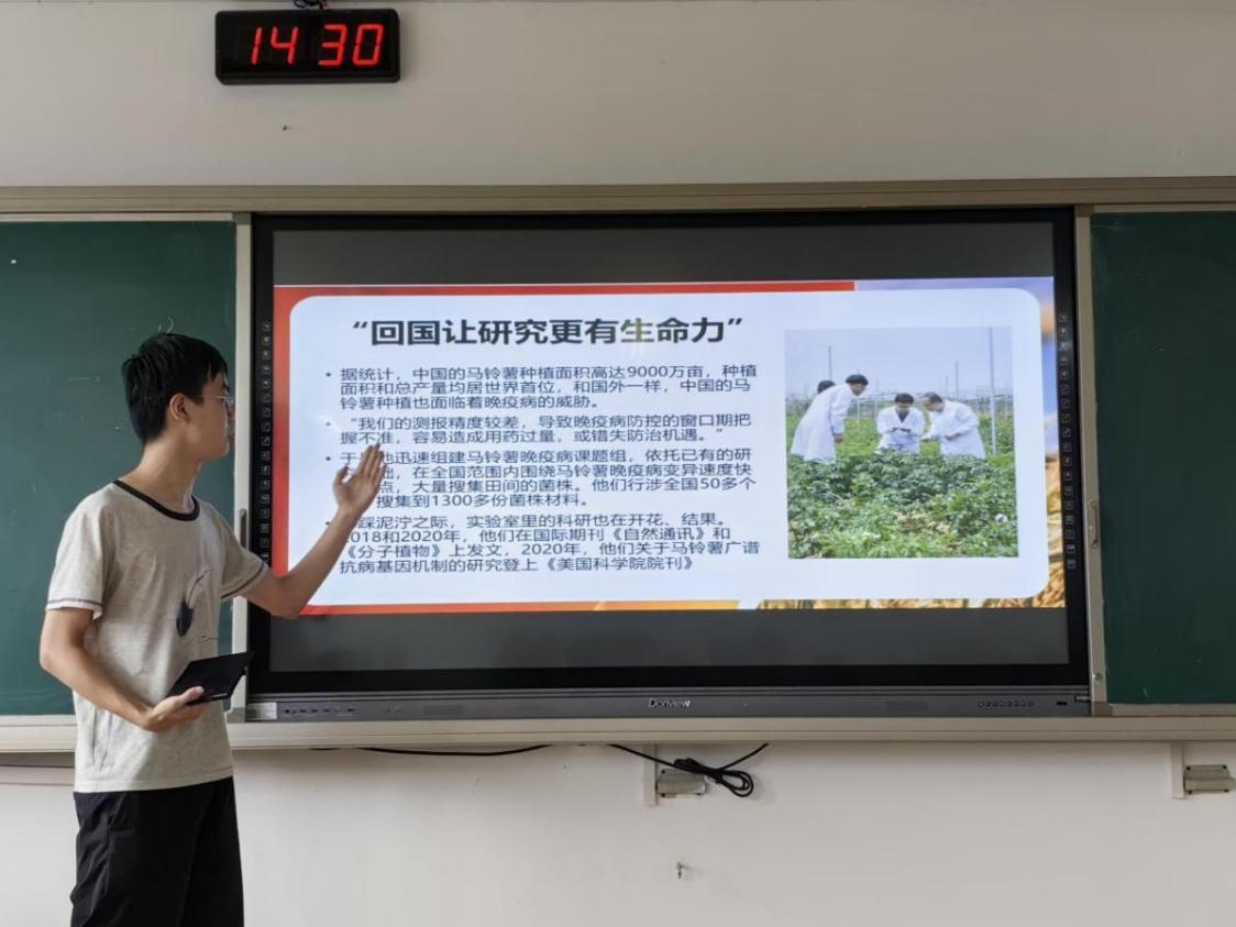 彭程带领大家学习了王春春书记在2023年新生典礼上讲话时提出的“农学人应肩负的时代责任”,即大格局、大情怀、大视野、大本领,并结合南农校友的优秀事迹为大家讲解如何具体做到这四点。“大情怀”之于农学生而言,便是三农情怀,是服务乡土的情怀,是用专业知识建设新农村的理想抱负。