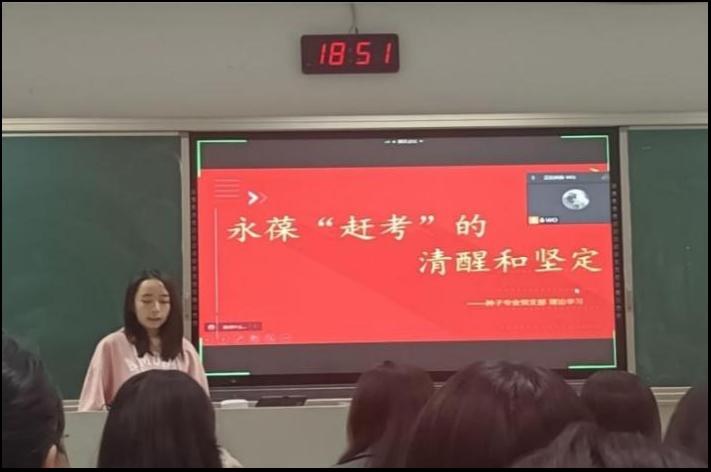 随后,韩旭同学开展了以永葆“赶考”的清醒和坚定为主题的理论学习,带领大家进一步体会习近平总书记在省部级主要领导干部专题研讨班上发表的重要讲话“我们党是世界上最大的马克思主义执政党,要巩固长期执政地位、始终赢得人民衷心拥护,必须永葆‘赶考’的清醒和坚定。”