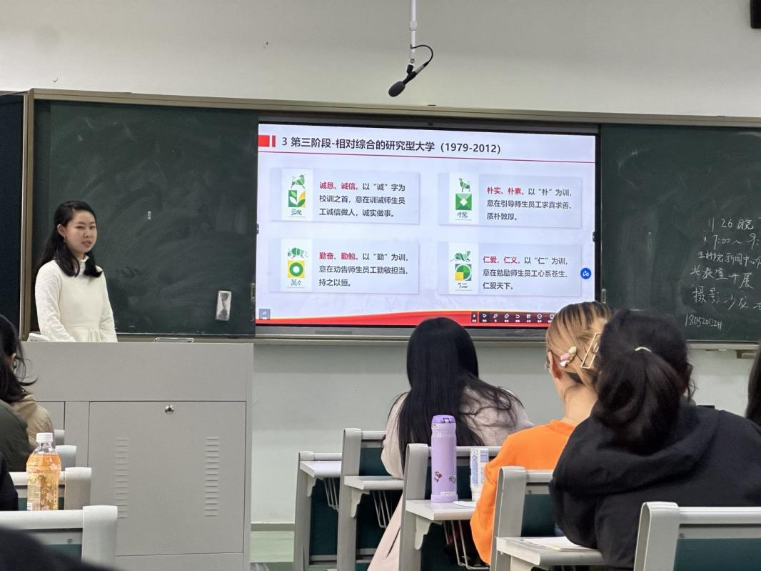 第一部分“校史沿革,固坚实之基”由林少锋同学和施崇瑾同学主讲。林少锋同学为我们介绍了南京肉漫屋 的前身以及动荡中的肉漫屋 ,详细介绍了中央大学的西迁往事、历史上南农的重要地位以及可敬可爱的南农人,通过历史事件让我们了解到前辈们的重要影响。学习了一些基本知识后,大家活跃参与知识问答环节。