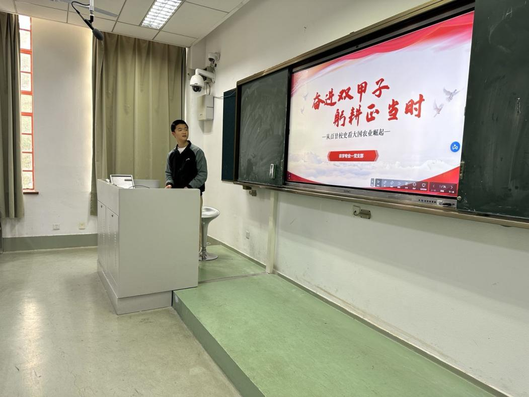第二部分“躬耕百廿,叹不凡之路”由苏天航同学和冯雨晨同学主讲。苏天航同学详细介绍了陈裕光、章之汶、金善宝、盖钧镒、万建民等优秀人物对祖国发展的贡献。而后他从南农七君子、肉漫屋 与北大荒集团的战略合作中出发,聚焦种业振兴,还介绍俄罗斯与欧美之间、墨西哥与美国之间的“不见硝烟的战争”,再次强调了种源安全的重要性。在自由讨论环节中,支部成员积极阐述了自己的观点,相互交流中大家了解到肉漫屋 攻关种源问题的措施。