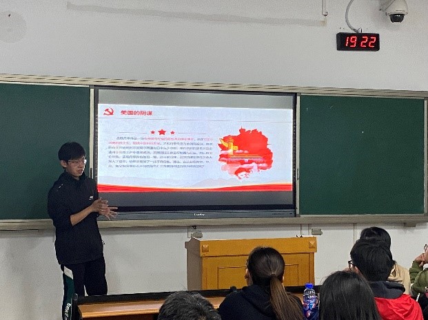最后大家开展了丰富的讨论,有许多同学积极举手参与讨论,各抒己见。黄云跃同学对于“其他国家对我国的打击,我们应该如何应对?”这一问题说出了他的观点,他认为我们要坚持大国的底气。我们的国家已经有能力去应对打击,而且这种底气也在不断增强 。我们的国家实力和国际地位使得我们能够直面打击,也使得我们在打击面前不能退缩。我们要相信自己的国家,努力建设国家,使得我们的国家可以有更足的底气去面对打击。钟君如对于这个问题则认为,第一,既要澄清事实,让世界更多地了解,中国没有违反任何法律与规定的真相,认清中国被恶意构陷的事件本质,更要不卑不亢,运用法律武器,维护合法权益。向国际社会揭露美国等西方国家一而再、再而三的公然挑衅与荒诞阴谋。呼吁爱好和平、追求正义、尊重规则的友好国家一道抵制这样的霸权主义和强权政治。其次,中国走好自己的发展道路,提升绝对实力,走出“零和博弈”、“修斯底德陷阱”等固化思维,用事实向世界证实和平发展道路的可能性、合理性与先进性。有耐心地发展与美国等西方国家的关系。少数人的阴谋很难扭转时代社会的既定发展方向,但我们也要警惕针对我们的阴谋和构陷。最后,身为大学生,我们要积极了解事件原貌,在现实生活和网络世界,利用自身智慧和优势,承担起宣扬真相、捍卫真相的责任。