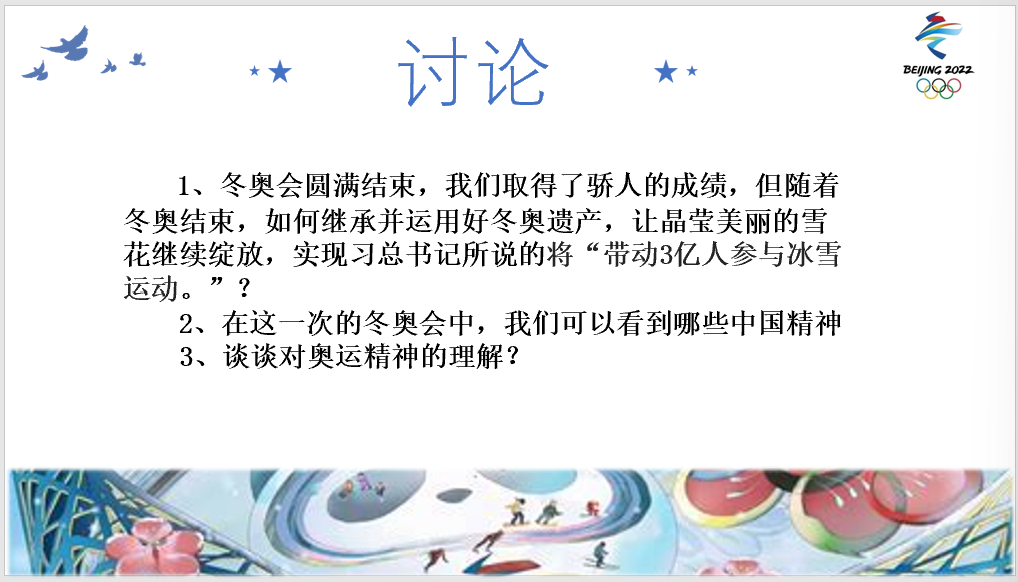 随后,第一小组组员就冬奥会开幕式中展现的中国式浪漫、中国奥运健儿在赛场上的风采以及世界眼中的冬奥会和大家做了分享。开幕式倒计时中24节气与24届冬奥会在立春开幕的巧妙结合,展现了中国人上世界展现的独特浪漫,升旗手的一滴落泪表达了中国人的骄傲与自豪。在介绍中,第一小组结合奥运小问题的抢答方式积极地与同学们展开了互动。