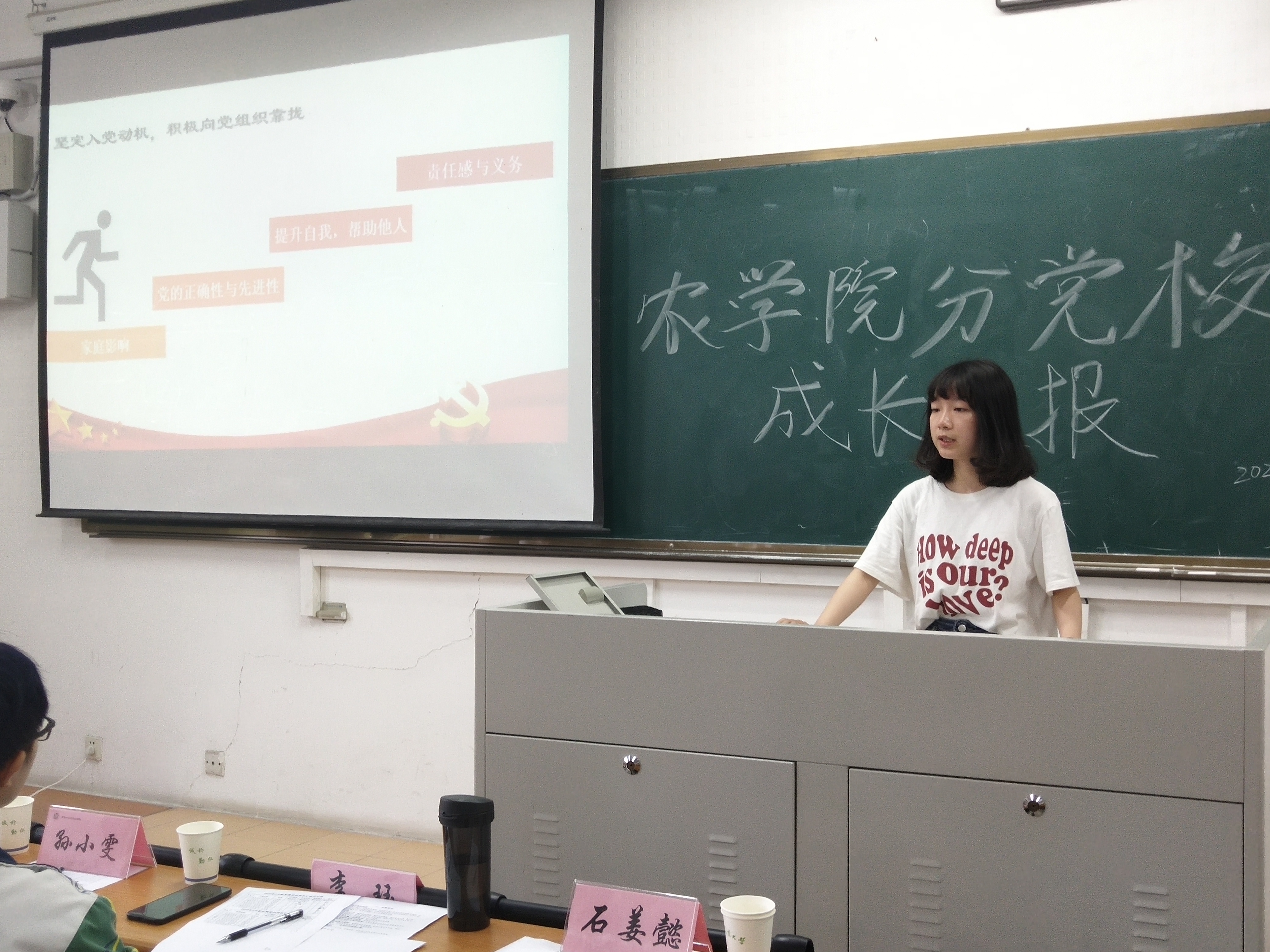 本次成长汇报会分为3分钟的PPT汇报展示环节和2分钟的提问环节2个部分。在PPT展示环节,预备党员们就自己成为预备党员后近一年来对党的理论学习和个人实践方面的变化和成长做了总结汇报。入党积极分子就自己的个人情况、入党动机、学习生活等方面介绍了自己成为积极分子以来的收获和反思,展示了自己的成长心得。在提问环节,各支委考察了大家对党史党章的学习、时事政治的了解程度,并提出了针对性的意见与建议。