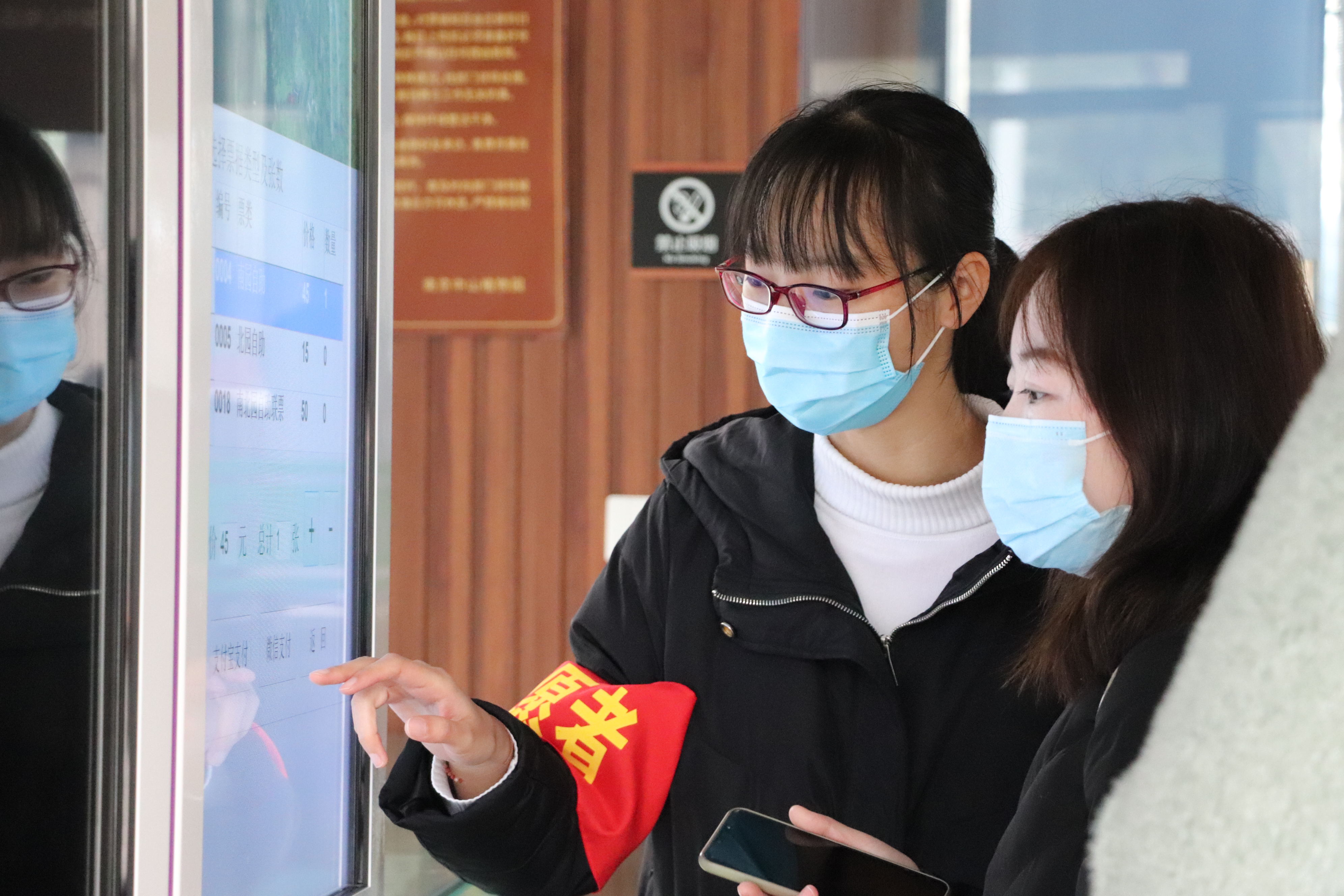 活动现场,售票处人流量很大,很多游客选择自动售票机购票,但是对自动售票机的使用并不熟悉。参与志愿活动的积极分子积极分子耐心地在一旁为游客解答疑问,帮助他们尽快买票,疏解售票处的压力。
