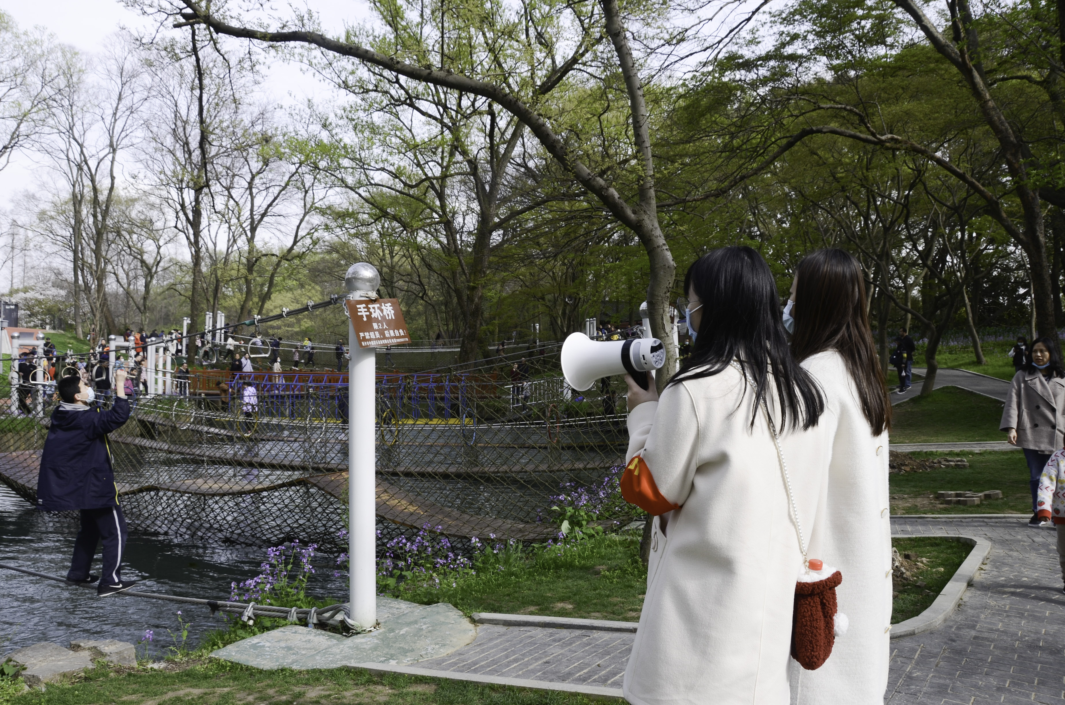 北园的桥世界也是游客参观的热门景点,但是由于有的桥设计得惊险刺激,不了解操作方法的小朋友或有些冒进的游客都可能造成危险,需要志愿者们负责在桥的周围巡逻,并及时提醒乘客注意安全。