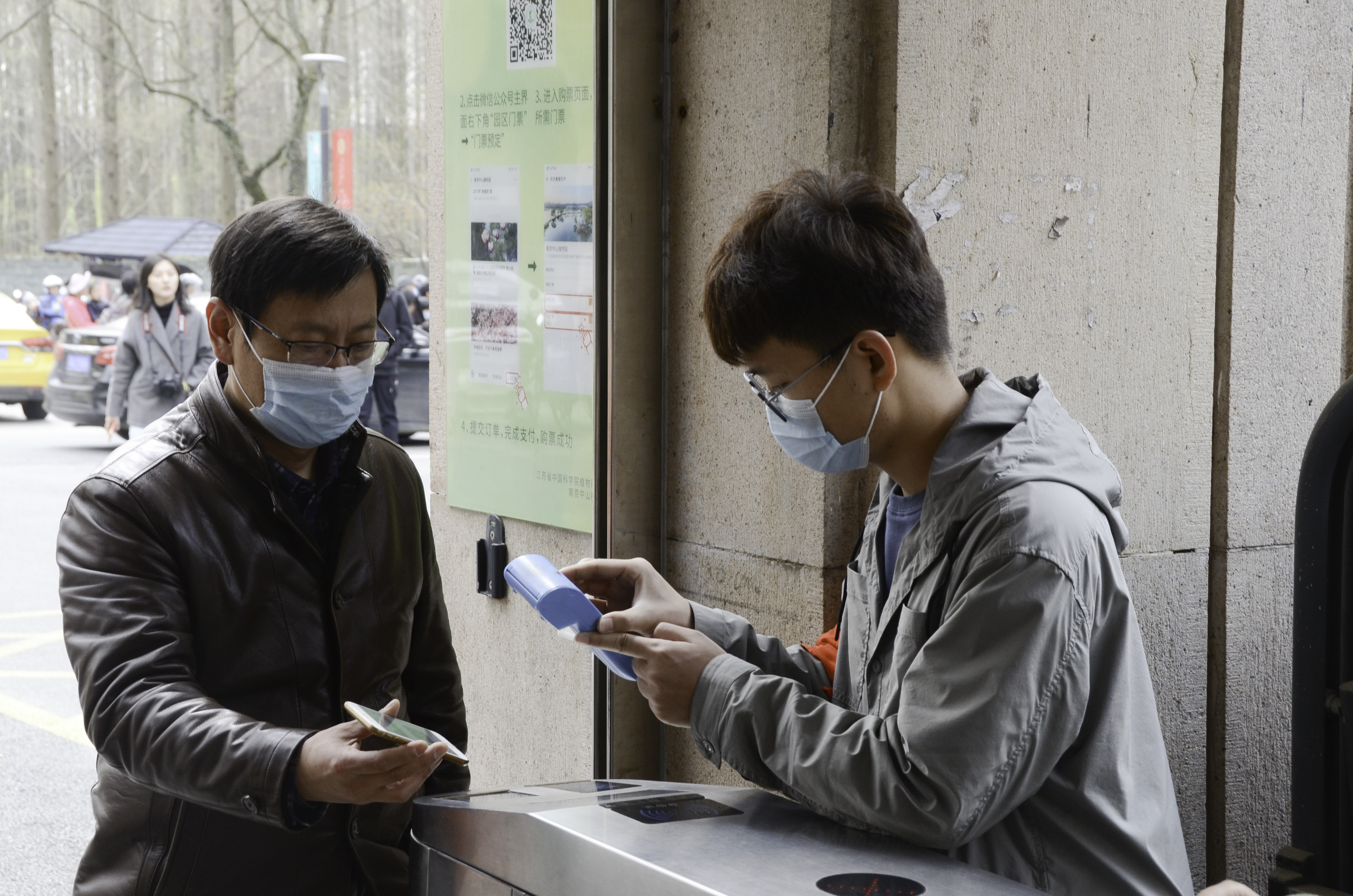 在南北园入口的检票处,积极分子们帮助植物园的工作人员进行检票和人员进出的管理。据植物园的工作人员说:“这几周是人流高峰,上周的时候游客们排队一直排到了山坡下的停车场。”检票处的志愿者们一刻不停,帮助游客扫码查验,加快了游客们进园的速度。