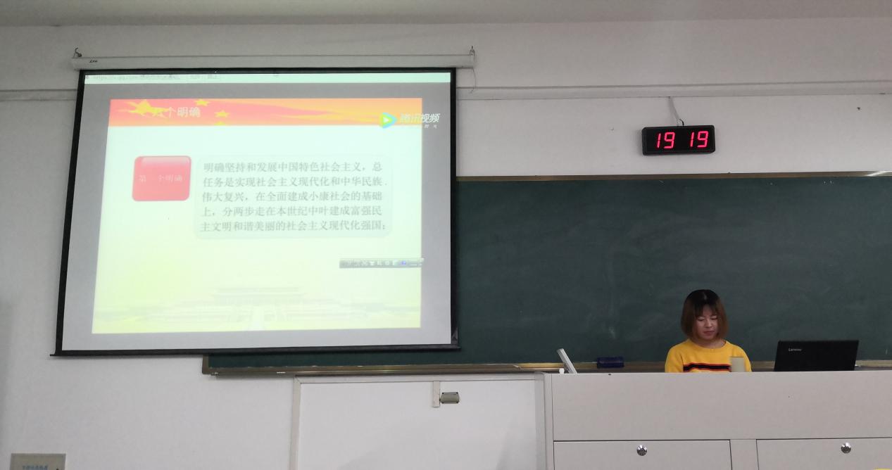 接着,马艳琴同学以一段视频带领大家更加具体的了解了《纲要》的重点部分--“八个明确”和“十四个坚持”,带领大家重温相关知识。